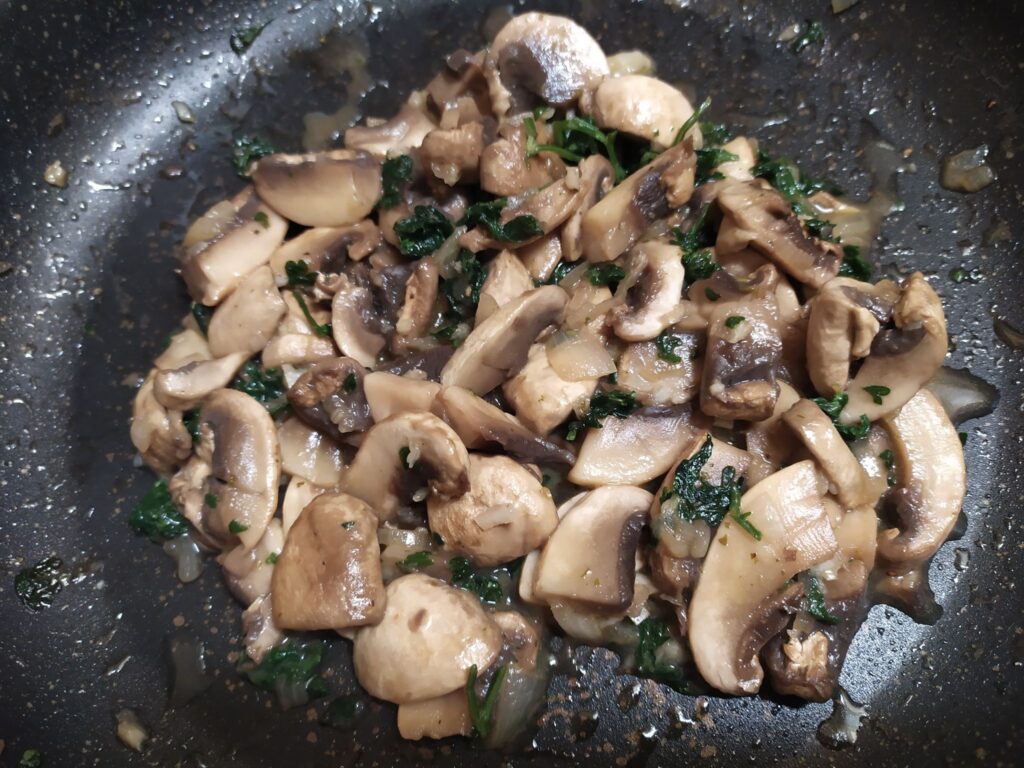 Commencez la préparation en nettoyant rinçant rapidement et en séchant les champignons. Coupez les plus gros en quartiers ou en lamelles.