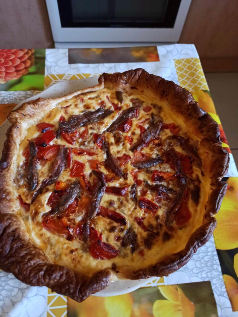 Ajouter ce mélange sur la pâte, thon, tomate.